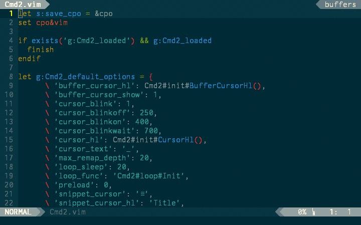 As Cmd2 renders the cmdline and menu using echo, there might be flickering. Changing the g:Cmd2_loop_sleep variable will have different effects depending on the terminal used. In general, a lower value should result in less flickering. Otherwise, setting g:Cmd2_cursor_blink to 0 will turn off the cursor blink, which will result in no re-rendering and hence no flickering.